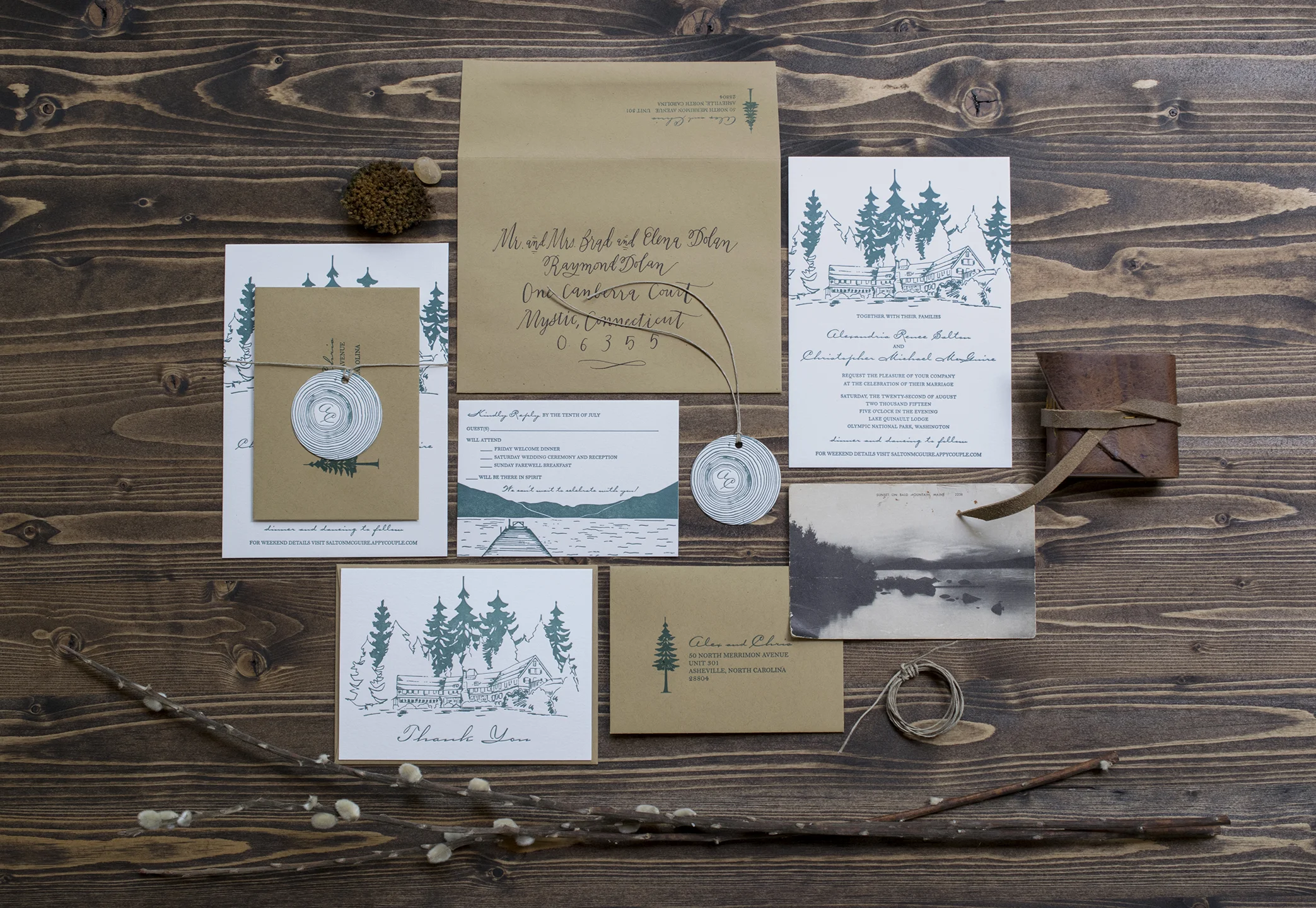 Alex & Chris: Letterpress Printed Invitation Suite with custom illustrations and calligraphy.