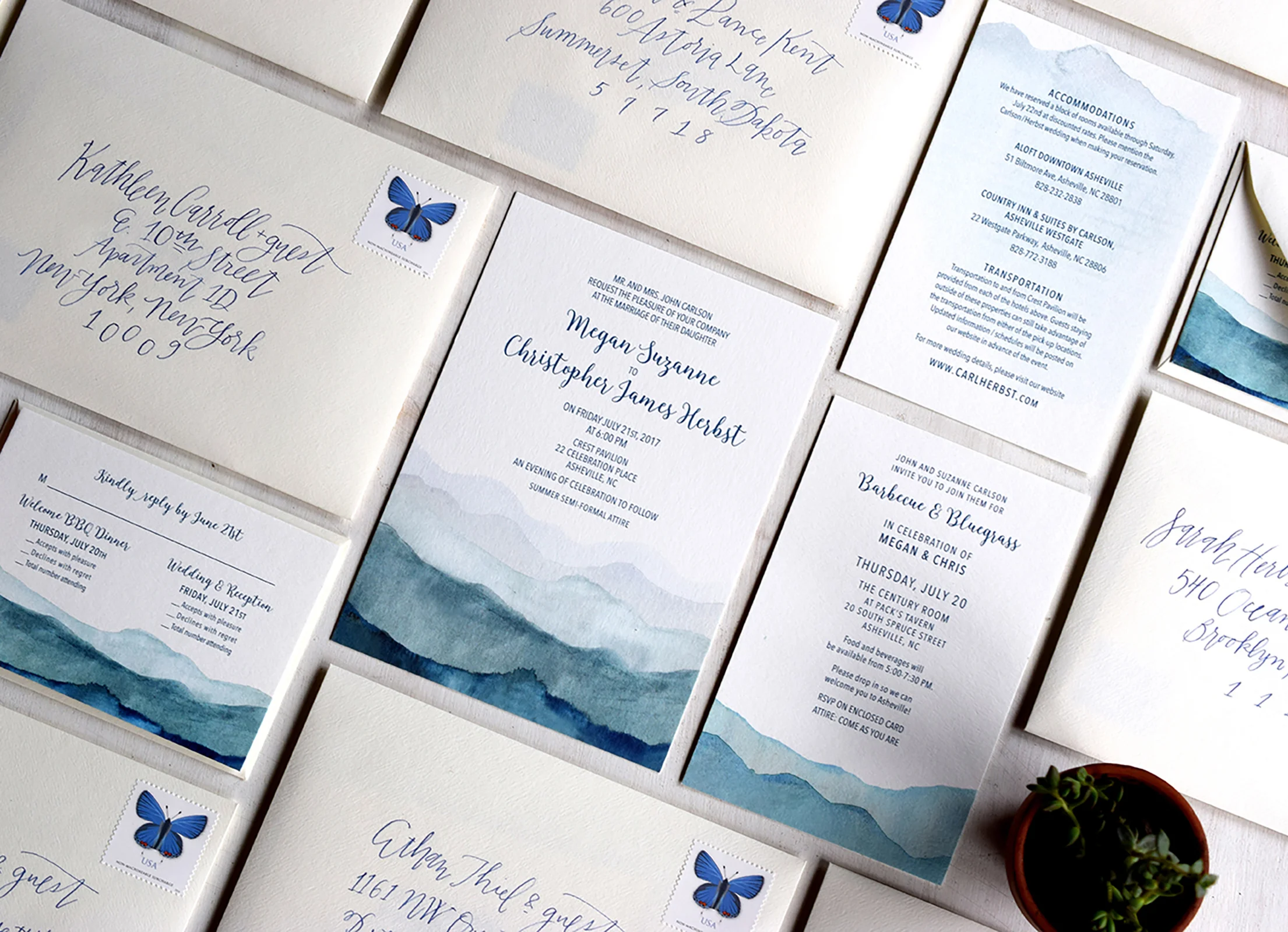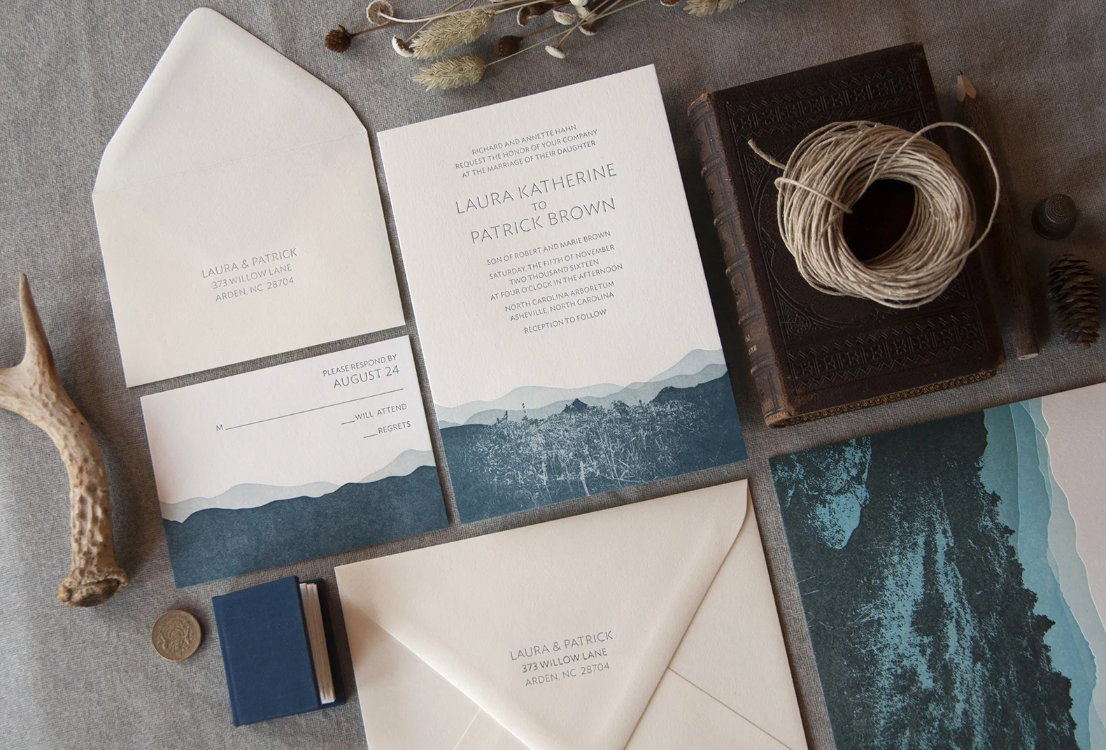 Blue Ridge Mountain: Letterpress Printed Wedding invitation suite. Customizable.
