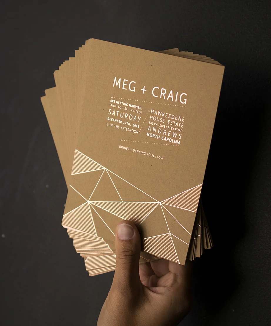 Meg & Craig: Rose Gold Foil on kraft paper. Designed at 7 Ton Co.