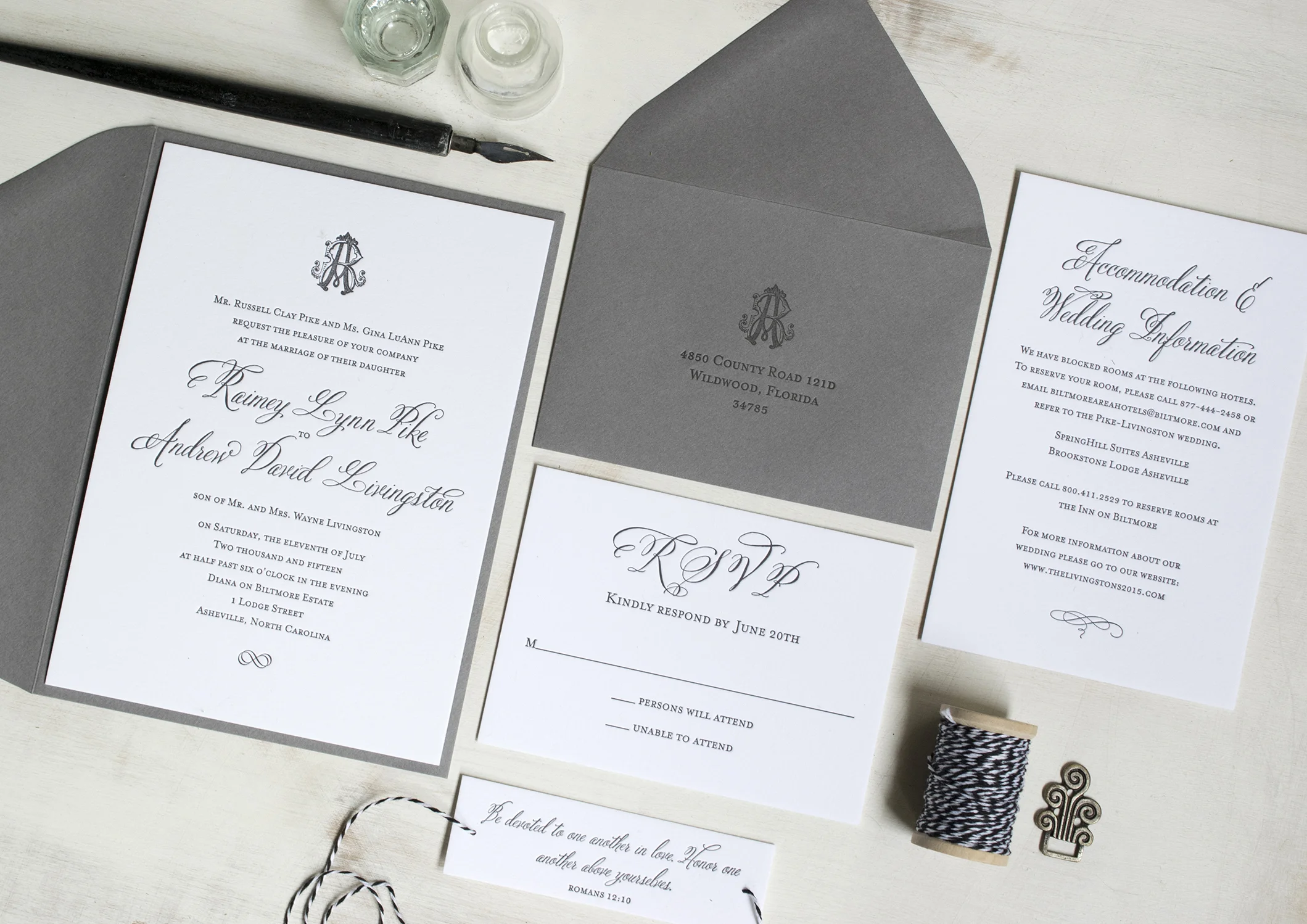 Raimey & Andrew: Letterpress printed wedding invitation suite. Designed at 7 Ton Co.