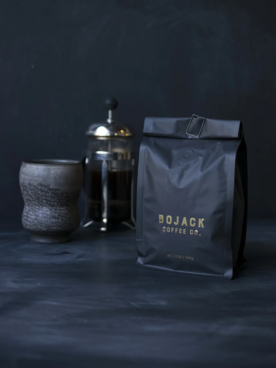 Bjoack Coffee Co. : Designed at 7 Ton Co. : Letterpress Printed in gold on matte black bags.