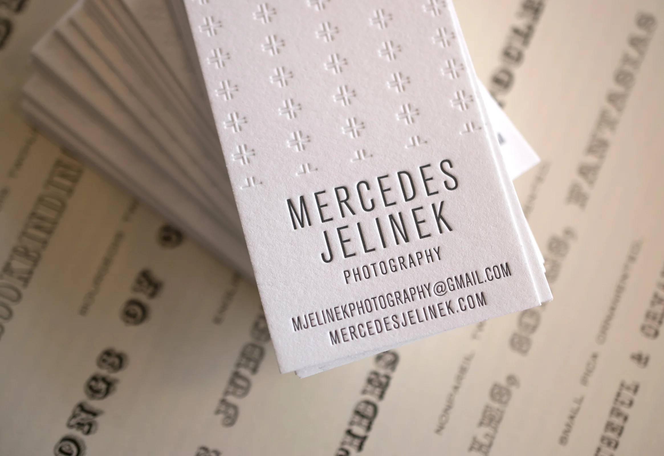 Mercedes Jelinek Business Cards : Letterpress Printed in two colors.