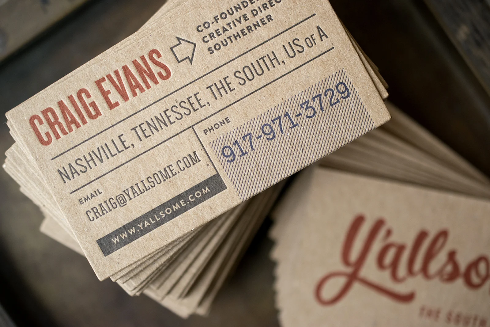 Y'allsome Business Cards : Design by Y'allsome : Letterpress Printed in two colors on two sides on recycled kraft.